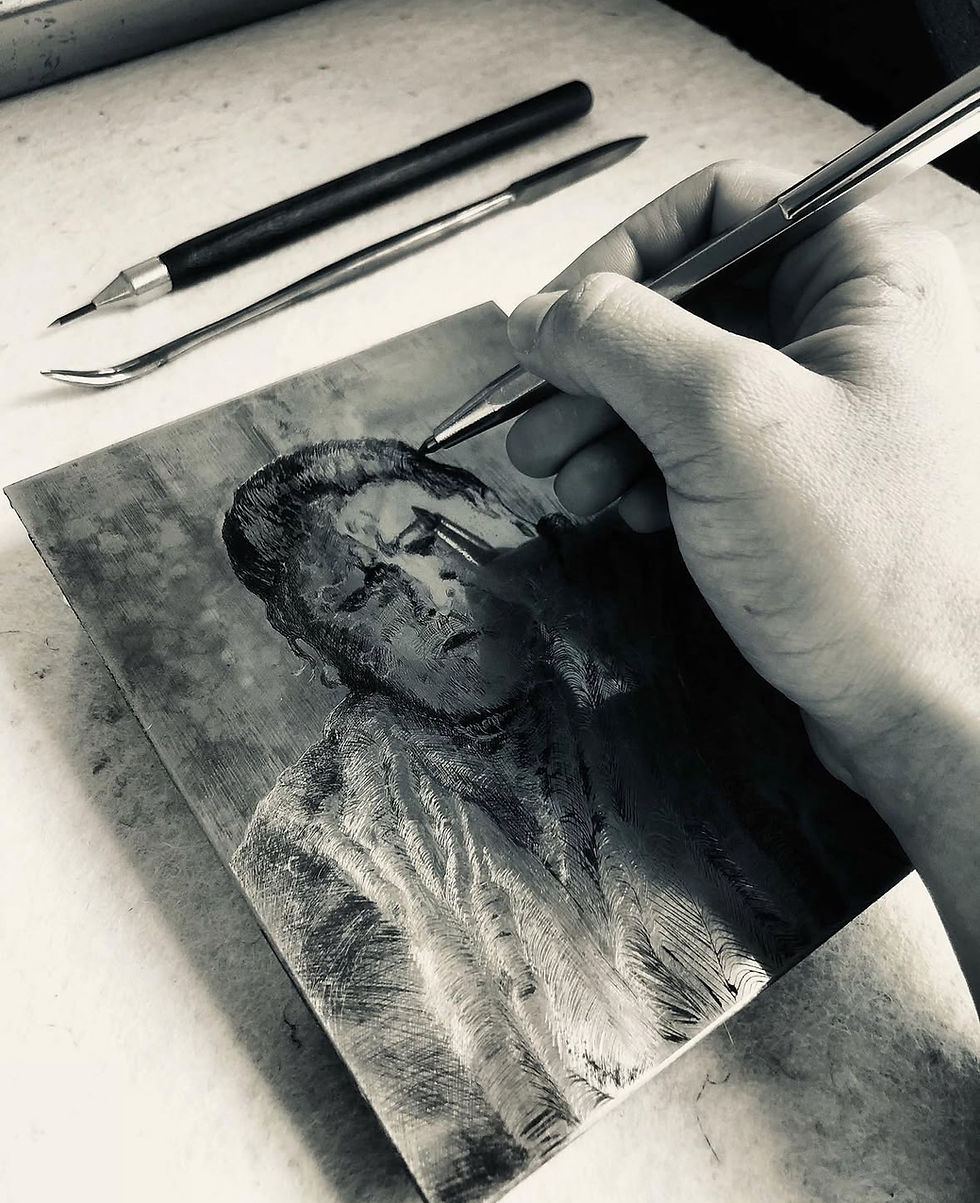 Mis colecciones de grabados nacen de un ritual íntimo que revela las luces y las sombras del ser humano. Son seriadas, firmadas y limitadas , con una carga espiritual que busca ser custodiada como un relicario contemporáneo. Trabajo la punta seca como canal de energía, donde cada línea guarda la fuerza, la pasión y el fuego del flamenco, junto al temple, la delicadeza y la vulnerabilidad, en diálogo con la tradición de grandes maestros como Goya, Rembrandt o Hokusai. En búsqueda de un puente cultural entre lo oriental y lo occidental.